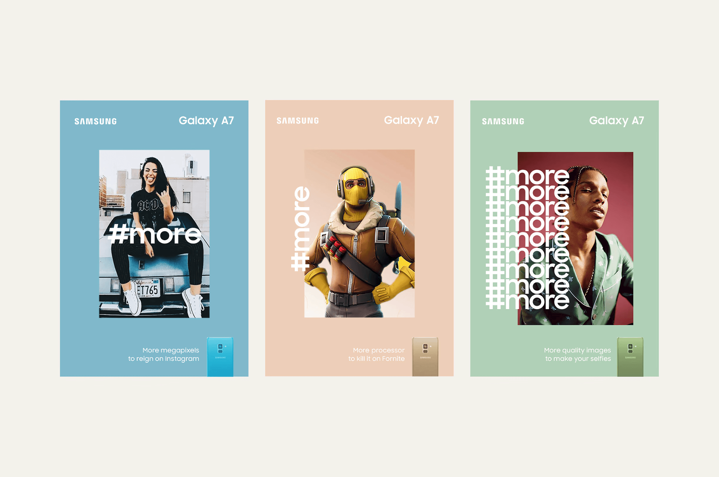 We worked with Samsung to launch the Galaxy A with a youth-focused campaign. It started with #More, a bold identity showcasing everything the phone could do, followed by Be the Inspiration, highlighting real users and encouraging them to share their stories.